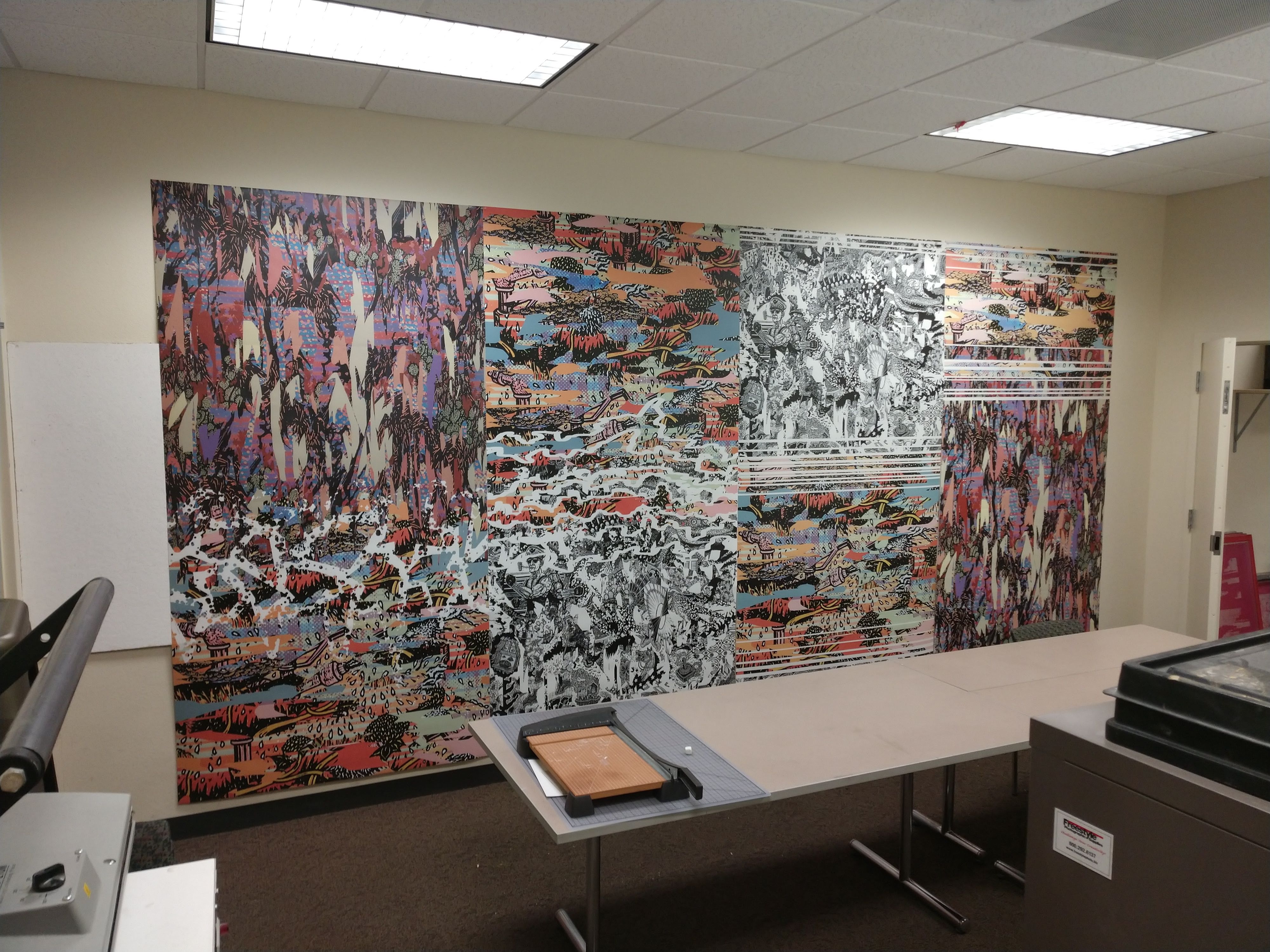 Pushy Palm, 2021, silkscreen, wood, and printed vinyl. Installed in the Zaffirini Success Center at TAMIU, Laredo, TX